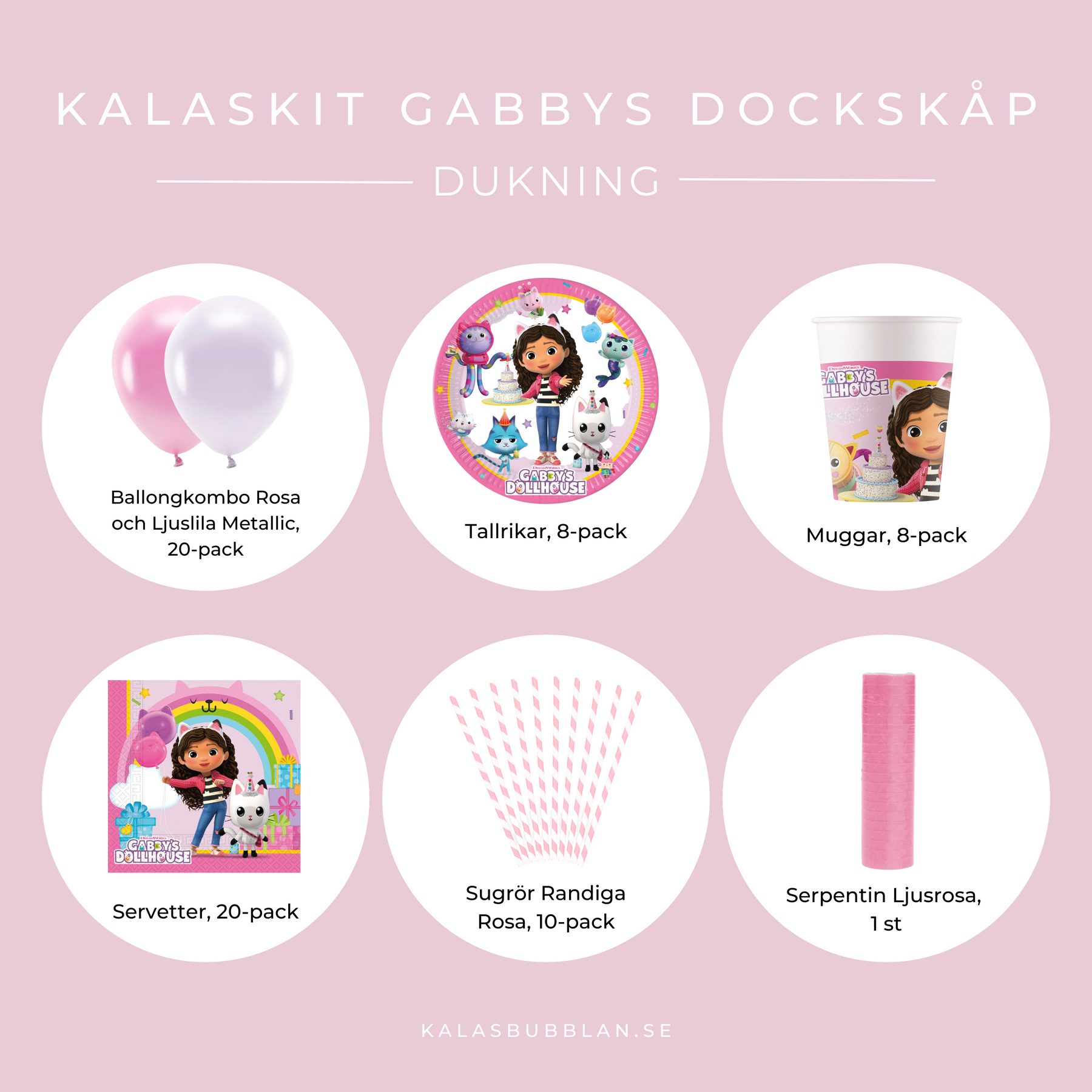 Perfekt för små fans av Gabby och hennes söta kattkompisar! För ett ännu mer komplett kalas kan du kombinera detta kit med vårt matchande Gabbys Dockskåp dekorationskit.